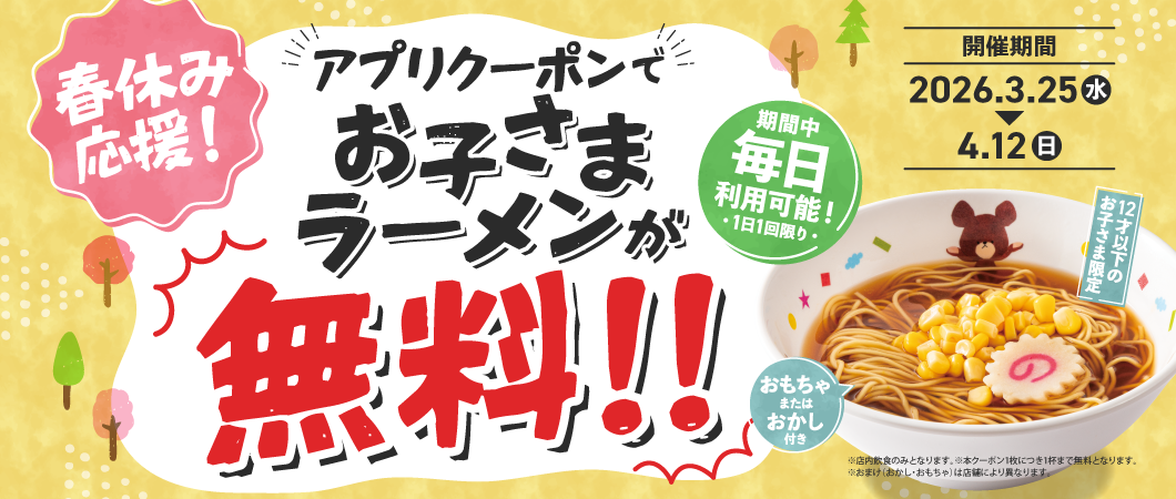 【お子さまラーメン無料キャンペーン】2026年3月25日~4月12日開催