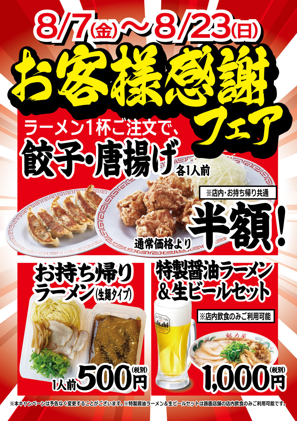 ※1)はラーメン1杯ご注文で何れか1品が半額。店内、お持ち帰り共通