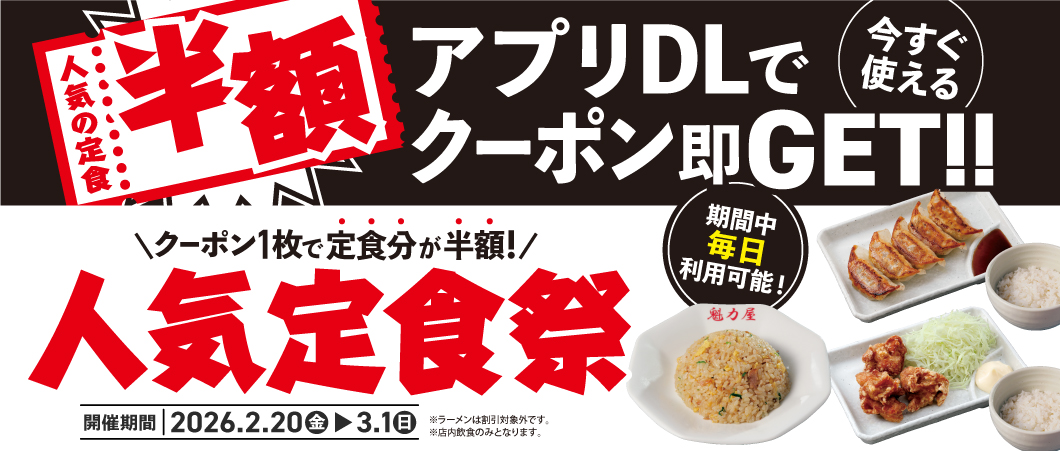 対象の人気定食3種の定食分が半額でお召し上がりいただけます。